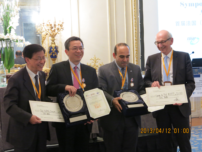 该奖项是EBMT依据法国法律设立的国际性医疗奖项,用于表彰对血液病诊治领域中做出科学创新及卓越成就个人或团体。EBMT奖项评审委员会强调此次授奖为奖励黄晓军在创立、完善亲属单倍型造血干细胞移植事业中所做出的突出贡献。EBMT巴黎总部负责人、“自体移植之父”高汉(Norbert C. Gorin)教授为黄晓军颁发奖杯和勋章,并称赞黄晓军这一成就将在世界范围内改变未来造血干细胞移植事业的格局。中国驻联合国教科文组织全权代表尤少忠先生、中国驻法大使馆科技公参韩军先生、EBMT主席马乐嘉(Alejandro Madrigal)教授、中国工程院院士阮长耿教授到会见证了这一重大历史时刻并表示祝贺。