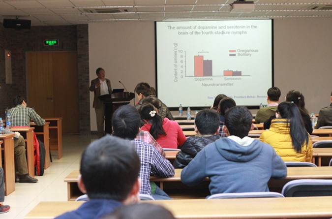 康乐院士首先向大家介绍了国际上对于群聚和散居两型机制的研究和现存的三种理论。通过介绍自己实验室的研究结果,指出飞蝗两型转变的启动与其嗅觉感受蛋白基因有密切关系,而飞蝗体内的多巴胺含量以及中间基因的调控则控制着飞蝗的两型转变。
