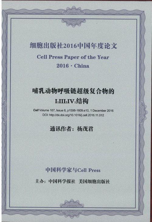 5月8日,细胞出版社2016中国年度论文、年度机构颁奖典礼暨前沿论坛在中国科学院生物物理所举行,生命中心杨茂君研究组发表的文章《哺乳动物呼吸链超级复合物I1III2IV1的结构》入选细胞出版社2016中国年度论文。