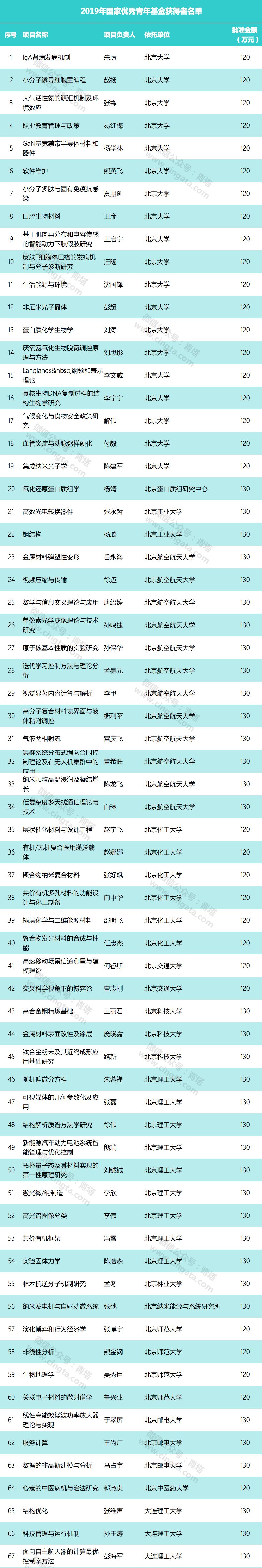 从统计数据来看,清华大学和浙江大学共有24人,并列第一。南京大学共有21人,位列第三位。北京大学和上海交通大学各有19人,并列第四位。此外,中国科学技术大学、中山大学、华中科技大学、西安交通大学、北京航空航天大学、同济大学等高校入选申请人也较多,表现不俗。下面是各单位的立项数和2019年国家优青获得者名单: