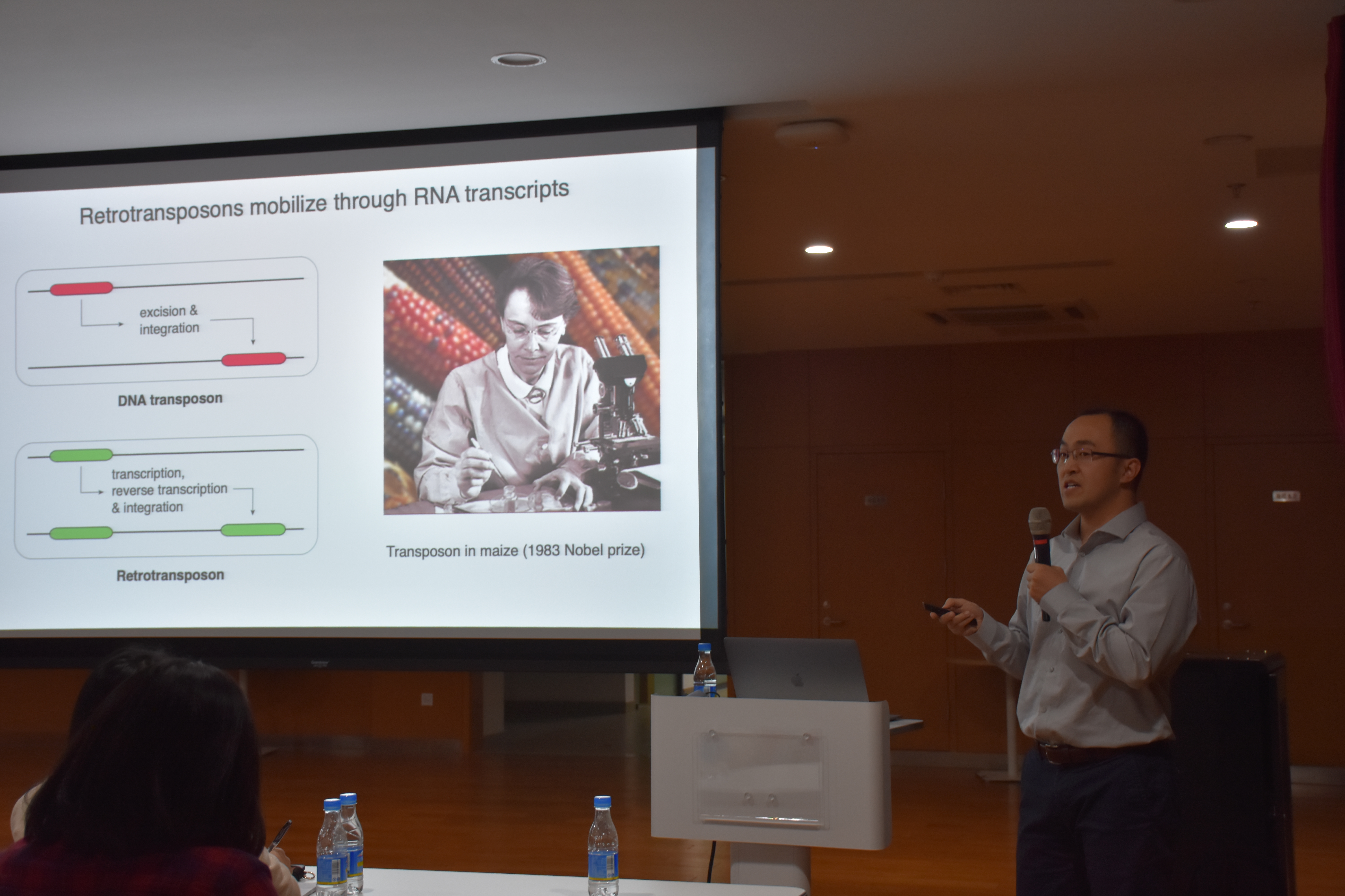 首先,刘念以 “Cross-talks between the human genome and transposons” 为题,介绍了在人体内转座子LINE-1是如何被调控的,以的调控因子及LINE-1如何通过表观遗传等途径来调控宿主基因表达。转座子是可以移动(或转座)的DNA,存在于几乎所有的生命体中,属于基因组中的“暗物质”。转座子在人体内大量富集,占据大约一半的人体DNA,并且仍然具有转座活性。人体转座子的活性与胚胎发育、神经发育以及上百种疾病密切相关,但是其相关机理和功能至今不是非常清楚。刘老师首先介绍了现阶段对转座子的认识及其对人体基因组进化与基因调控的重要作用。目前发现反转录转座元件LINE-1是人体内唯一一种可以自主移动的转座子,在胚胎和神经发育中起着重要的作用。但是,LINE-1活性如何受调控并不是非常清楚。为此,他通过在细胞系中构建LINE-1 reporter,利用CRISPR/Cas9基因敲除技术在人体全基因组范围内对影响LINE-1活性的基因进行筛选。最终获得大约150个基因能够调控LINE-1的活性,这些基因涉及转录、翻译、DNA 复制和损伤修复等过程,为研究转座子活性调控提供了宝贵的资源。接下来刘老师首先选择了三个在转录水平上能够抑制LINE-1活性的基因HUSH (MPP8, TASOR) 和MORC2进行机理研究。发现HUSH和MORC2通过相互合作,能选择性地结合并抑制基因组上年轻的全长LINE-1。他还发现受抑制的LINE-1经常处于宿主基因的内含子中。当内含子中的LINE-1被抑制,该宿主基因的表达也会随之被抑制。这一现象阐释了转座子如何通过表观遗传进一步影响宿主基因的表达。另外,刘老师还介绍了实验室目前正在对另一个转录水平上能够抑制LINE-1活性的基因SAFB进行研究。SAFB在大脑海马区显著高表达,另一方面LINE-1在大脑中的活性显著高于其他组织,提示SAFB对海马区神经元细胞的LINE-1 有调控作用。通过RNA测序数据,他们发现SAFB的敲除使得位于宿主基因内含子的LINE-1表达特异性增加,同时影响宿主基因的可变剪切。实验室正在进一步研究该LINE-1调控因子如何影响人体基因表达相关的相关机理及其对神经发育的作用。在提问交流环节,中心PI沈晓骅、颉伟、Lucas和李志远等就位于宿主基因内含子中LINE-1的比例和功能进行了相关提问并进行深入讨论。