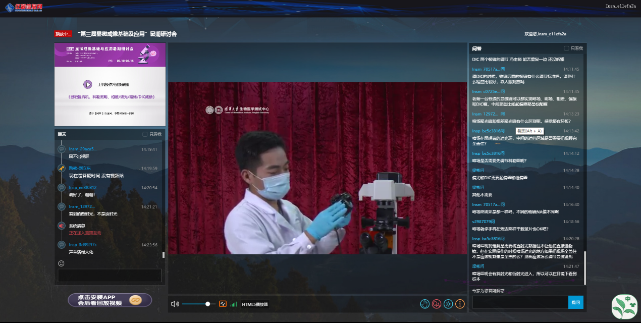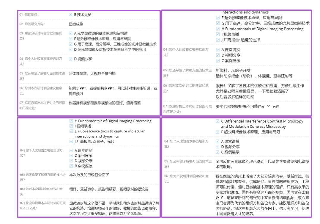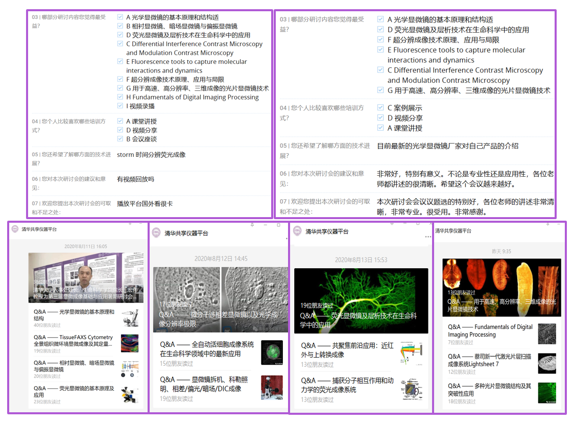 会上8位授课嘉宾分别就显微成像研究与技术领域为学员进行授课,从显微镜的成像光路、各类显微镜成像原理、分辨率的数学推导到显微镜的最新应用、超高分辨的发展方向、大组织快速光片技术和数据处理技术等,使学员们经历了一次系统的显微成像之旅。同时,为了弥补疫情期间无法实地安排学员上机的不足,清华大学生物医学测试中心和西湖大学生物医学实验技术中心特别录制了光学成像仪器拆装机视频和电子化操作教程,具有多年从事显微成像技术的资深专业人员为学员们打开了一种新的学习体验,深受大家的好评。每天会议结束后,主办方将问答列表整理成文字形式,及时反馈,解决了线上无法面对面交流的不足,得到学员的一致认可。