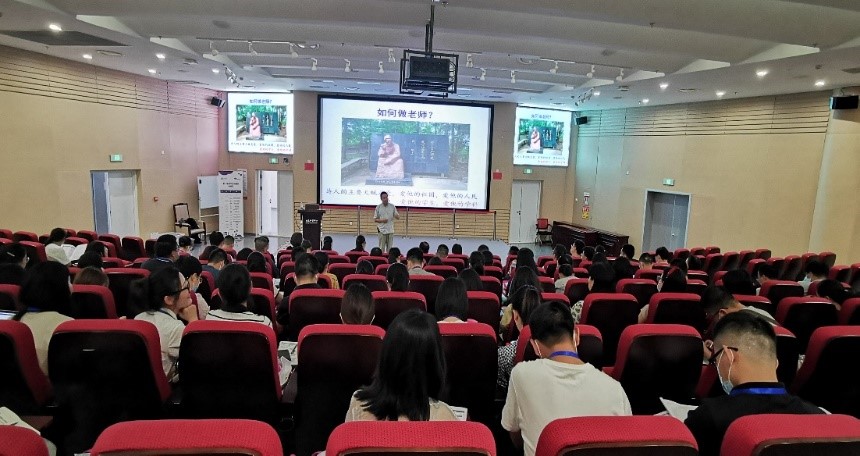 7月19日上午的开班典礼上,生命科学联合中心PI、生命科学学院副院长欧光朔发表致辞。欧老师首先对参加本次培训班的学员表达了诚挚的欢迎,随后以“如何做老师”、“如何做高中老师”、“如何做高中生物老师”三个问题为引子,结合自身的求学与科研经历,层层推进,并引用习近平总书记在全国高校思想政治工作会议上强调的一句话勉励各位学员-不只做传授书本知识的教书匠,而要成为塑造学生品格、品行、品味的“大先生”。在日常的教学中启发学生独立之精神,自由之思想,带领学生扩展认识自然的边界,开辟新的认知疆域。