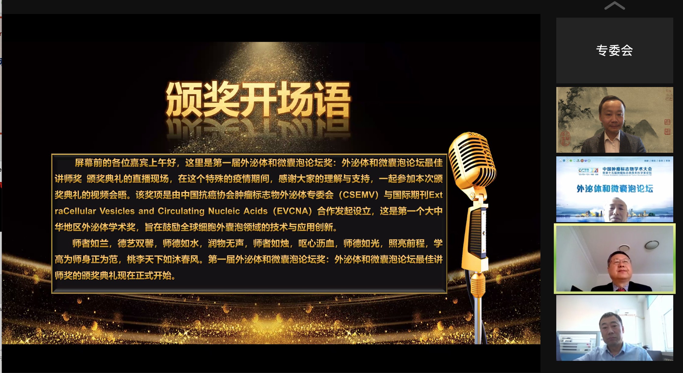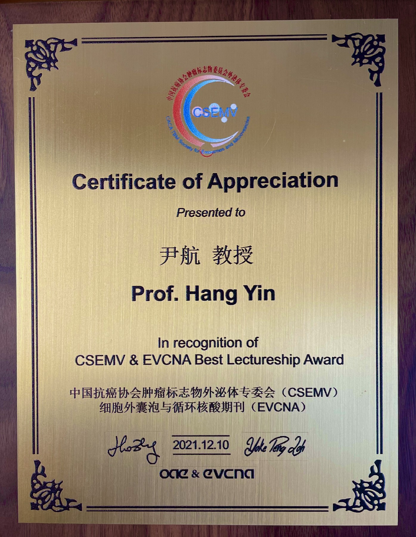 2021年12月12日中国肿瘤标志物学术大会隆重召开,中外科学家齐聚云端。中国抗癌学会外泌体技术专家委员会公布生命中心PI尹航获得该协会2021年度首届CSEMV & EVCNA Lectureship Award。该奖项是由中国抗癌协会肿瘤标志物外泌体专委会(CSEMV)与国际液体活检学会(The International Society of Liquid Biopsy (ISLB))旗下的期刊Extracellular Vesicles and Circulating Nucleic Acids(EVCNA)联合发起设立第一届外泌体和微囊泡论坛奖:CSEMV & EVCNA Lectureship Award-2021(外泌体和微囊泡论坛讲座奖)。这是国内的首个外泌体研究领域的奖项,该奖项的设立旨在鼓励全球细胞外囊泡领域的技术与应用的创新,每年授予一名在外泌体领域取得突出贡献的资深研究人员。本次线上颁奖仪式由澳大利亚新南威尔士大学李勇教授主持, CSEMV主席张灏教授代表协会颁奖, EVCNA主编美国国立卫生院资深研究员Yoke Peng Loh博士致辞。