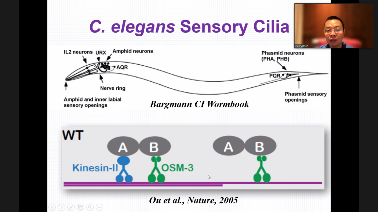 交流会开始,欧光朔首先做了题为“RNA编辑限制过度活化的纤毛激酶”的报告。纤毛是广泛存在于真核细胞表面的细胞器:其在细胞运动和外界信号感知的过程中起着重要的作用;纤毛结构和功能的异常会导致多种纤毛疾病。纤毛激酶在纤毛的形成、 维持以及纤毛马达蛋白的正常工作中起到至关重要的作用,人类MAK(Male Associated Kinase)激酶在线虫中的同源基因dyf-5的缺失突变会导致嗅觉纤毛的异常。出人意料的是,DYF-5在体外实验中显示出组成性活化的突变形式DYF-5CA(T164E)却在纤毛内产生了和缺失突变相同的表型。欧光朔实验室通过遗传抑制子筛选,发现在定位在细胞核内的ADR-2的突变可以挽救DYF-5CA的纤 毛异常表型。ADR-2是一种作用在双链RNA上的腺苷脱氨酶(Adenosine Deaminase Acting on RNA),在细胞内负责RNA编辑:ADR-2使腺嘌呤核苷脱氨基为次黄嘌呤核苷,产生A-to-I的转换,从而实现RNA的A-to-G编辑。 虽然此前蛋白质活性在基因转录水平上调控蛋白的生成广为人知,但是蛋白质活性在转录后水平上通过RNA编辑限制该蛋白的翻译 则鲜有报道。因此,此项发现丰富了对病理状态下遗传信息传递的认识,同时这也提示了纤毛疾病可能可以通过“纤毛外”的手段 进行干预和治疗。