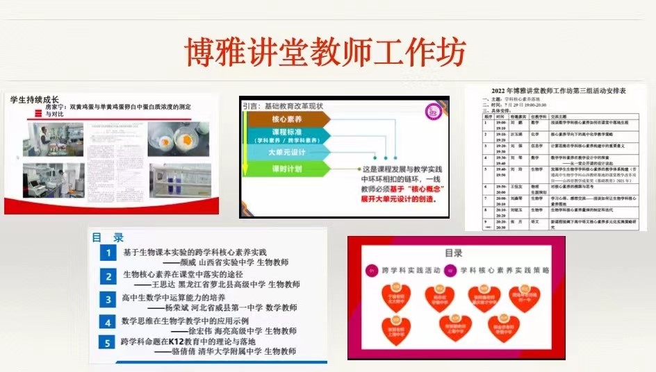 为响应北京市和学校疫情防控要求,本次博雅讲堂采用线上腾讯会议的方式进行。本届博雅讲堂延续了以往的高水平师资,由陈鹏、邓兴旺、鄂维南、方方、黄晓军、刘国恩、罗述金、李志远、渠敬东、饶毅、王恩哥、朱青生12位不同学科专家组成的“地表最强”授课阵容为大家带来一系列横跨理、工、农、医、人文社科等领域的知识盛宴。虽然各位中学老师未能在燕园相聚,但因为线上交流的形式灵活、时间充分,专家们博古论今、旁征博引,耐心解答学员们关于教育的困惑,心灵的距离得以无限缩小。除了专家授课外,今年的博雅讲堂特别设置了“经验交流与分享”环节,邀请到北大附中生物组于璇、尹丽媛、柏叶3位优秀的中学生物教师给学员们分享附中生物课程的教学和改革经验,反响热烈。7月29日晚,第一期“博雅讲堂教师工作坊”启动,来自全国各地的优秀高中老师毫无保留地分享自己在日常工作中的所思所感,共同商讨如何更好地培养未来人才。