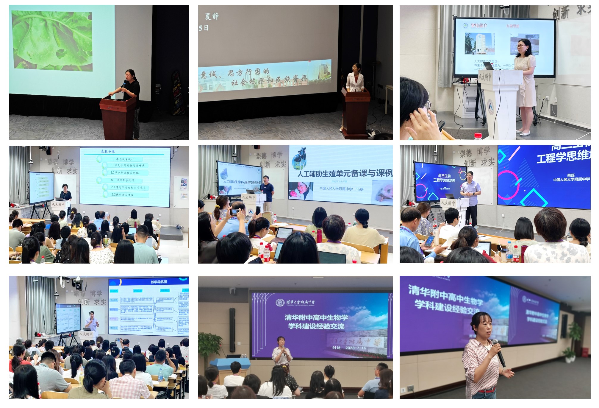 本次研修班还邀请了人大附中、十一学校以及清华附中的一线教师分享教学经验,他们精心准备授课内容,为学员们的课堂教学优化和专业成长提供助力。7月15日下午,十一学校的夏静、付鑫、窦向梅、李艳芳四位老师分别带来了题为“任务驱动的单元整体设计”、“科学素养指向的高中生物学命题评价”、“双减背景下科技教育活动的实施与探索”、“设计并制作血氧仪跨学科项目设计与实践”的教学报告。7月16日下午,清华附中的刘健老师就高中生物学学科建设经验与学员进行了交流分享。7月17日下午,人大附中生物教研组组长闫新霞老师与学员就“落实学科核心素养的高中生物学教学”进行了分享;蔡磊、马磊与吕继华老师则分别分享了高三课例“生物工程学思维培养”、高二课例“人工辅助生殖单元备课”与高一课例“基于深度学习的模型法”。三所学校的老师们结合学校的学科特点从不同角度给学员带来理论与实际相结合的教学理念,希望引发学员们相互学习、分享经验,反思、探讨与教育教学实践有关的问题,提升教师集体的实践智慧。