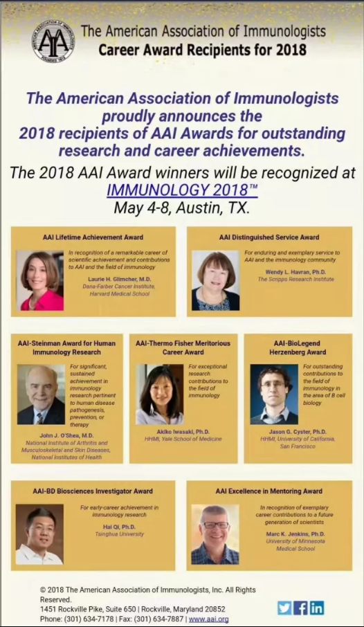 2018-01-14生命中心PI祁海教授荣获2018年美国免疫学家协会研究者奖 -