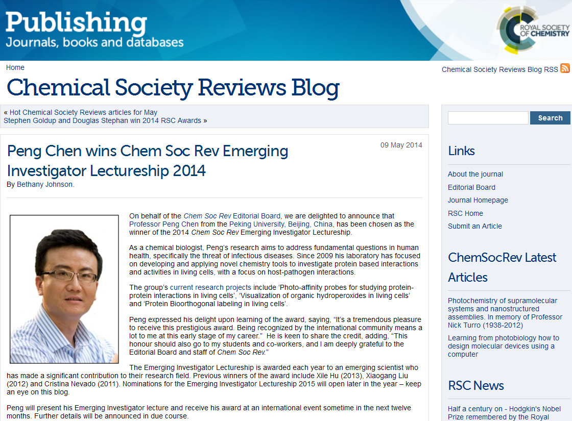 2014-05-13陈鹏获英国皇家化学会“《化学会评论》新科学家奖” -