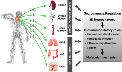 课题组跨学科整合全组织三维成像、光/化学遗传学、动物疾病模型及人类临床样本,建立了领先的神经免疫研究平台。课题组已在经典免疫器官天然免疫、肺部2型免疫反应、肠道急性炎症、肿瘤免疫等多个方面取得创新性成果,开拓了不同生理或病理条件下神经免疫调控的全新视角。不仅如此,课题组最新工作探索了神经退行性疾病或代谢类疾病中神经免疫调控的重要功能。这些研究成果将为利用特异性神经信号治疗不同免疫相关疾病提供关键的理论切入点。