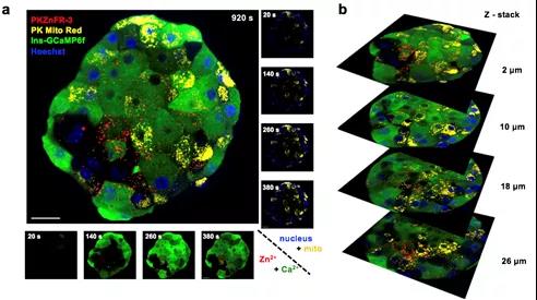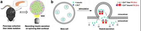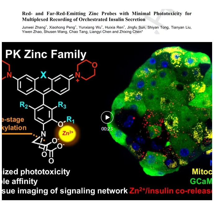 胰岛素在胰岛β细胞中与锌离子共结晶形成致密核心并在高浓度葡萄糖刺激下共同释放至细胞外参与血糖调控,所以特异性标记胰岛素/Zn2+晶体结构可以指示胰岛素囊泡分泌事件。北京大学分子医学研究所彭晓红博士在陈良怡教授的指导下,研发了一套新的胰岛成像技术来探究胰岛素的分泌机制:利用锌离子荧光探针特异性标记Zn2+/胰岛素的晶体结构,采用高速转盘共聚焦显微镜(spinning-disc confocal microscopy)成像,可在无损胰岛上观察每个β细胞的胰岛素囊泡分泌事件。但市面上的锌离子荧光探针仍存在亲和力普遍过高、发射波长较短而无法与其他颜色荧光探针联用、生物相容性差、光毒性较高等问题,限制了其在该技术中的应用。