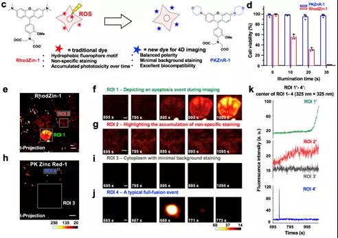 远红发射的荧光探针可以与其他通道的荧光探针联用以揭示生物体内不同活性物种间的相互作用,但其化学合成往往面临较大挑战。团队应用全新的化学合成策略(late-stageN-alkylation),实现了以硅罗丹明为母体的远红锌离子探针PKZnFR 1-3的温和、高效合成。其中化学稳定性最优的PKZnFR-3通过与蓝色细胞核染料Hoechst,绿色可遗传编码钙离子探针GCaMP6f,红色低光毒性线粒体探针PK Mito Red联用,实现了四色、3D、长时程荧光成像,并通过数据分析初步探索了钙离子内流、线粒体信号以及胰岛素囊泡分泌事件的异质性及三者之间的复杂关系。