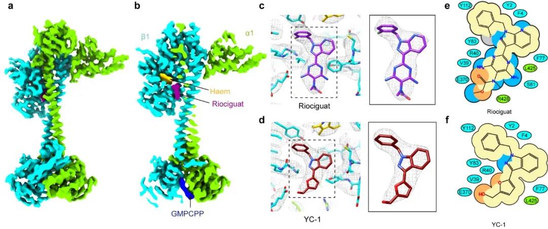 2021年9月17日,生命科学联合中心,北京大学未来技术学院分子医学研究所陈雷研究组解析了人源sGC全长蛋白与刺激剂YC-1和riociguat以及激活剂cinaciguat复合物的高分辨结构,揭示了小分子药物与sGC相互作用模式,并阐明了药物的激活机制。该文章发表于Nature Communications杂志(全文链接https://www.nature.com/articles/s41467-021-25617-0)。一氧化氮(NO)作为一种气体信号分子,在诸多生理过程中发挥重要作用,包括但不限于血管舒张、血小板凝集、神经信号传递和呼吸作用等。NO也是第一个信号通路被完整描述的动物自身合成的气体信号分子1。以心血管系统为例,血液流动产生的剪切力等刺激使得血管内皮细胞内的钙离子浓度升高,从而促进钙调蛋白激活一氧化氮合酶生成NO。随后NO通过自由扩散作用进入邻近的平滑肌细胞,结合并激活胞内的一氧化氮受体——可溶性鸟苷酸环化酶(sGC),催化GTP环化为cGMP。cGMP作为第二信使,作用于下游多个效应蛋白如PKG来影响诸多生理过程2。在此信号通路中,sGC作为NO受体,对信号的接收和放大具有关键作用,是重要的药物靶点。目前,靶向sGC的药物riociguat(利奥西呱)在临床上用于治疗肺动脉高压3。今年1月,vericiguat(维利西呱)被美国FDA批准用于治疗心衰。sGC是异源二聚体蛋白,由α和β两个亚基组成,每个亚基包含4个结构域:H-NOX, PAS, CC和催化结构域。2019年陈雷研究组解析了人源sGC全长蛋白在静息状态结构和NO结合的激活状态结构4。这些结构显示β亚基的H-NOX结构域含有一个可结合NO的亚铁血红素。NO结合会引起H-NOX结构域和整个蛋白分子的构象变化,使得sGC由静息状态转变为高活力激活状态。在病理状态下,亚铁血红素可被氧化成三价铁血红素,导致sGC不能结合NO,并处于低活力状态,阻碍了NO信号的传递。此外,三价铁血红素与sGC的亲和力很弱,易丢失6。sGC的活力降低与很多疾病密切相关。因此提高sGC活力以增强NO下游信号可用来治疗高血压等疾病。目前用于提高sGC活力的小分子药物可分为两类:一类是刺激剂,结合含有亚铁血红素的sGC,与NO协同激活sGC,适用于sGC功能正常但上游NO较少的情况,riociguat和vericiguat均属于此类小分子;另一类是激活剂,可结合含有三价铁血红素或不含血红素的sGC并将其直接激活,适用于氧化导致的sGC功能受损7,8。尽管提高sGC活力的小分子药物有重要的治疗作用,但其如何与sGC相互作用并激活sGC仍不清楚。在寻找sGC刺激剂的浪潮中,最先发现的小分子是YC-1,它可以称为sGC刺激剂之母,后续发现的很多sGC刺激剂都是在YC-1骨架的基础上进行改进与优化而获得的。其中Bayer公司开发的riociguat由于其高激活能力及良好的药物代谢动力学特性,已脱颖而出,用于临床治疗。陈雷研究组制备了sGC与NO及YC-1或riociguat复合物的冷冻电镜样品,三维重构分辩率分别达到3.9Å和3.6Å。结构显示:YC-1和riociguat结合位点一致,均位于βH-NOX结构域和 CC结构域之间的缝隙中,这也与二者之间相似的分子结构相吻合。YC-1和riociguat的功能基团均与周围的β1Y112,Y2, F4,Y83, F77, V39, R40,E370和α1L425相互作用,但riociguat增加的二氨基嘧啶基团还另外与β1S81有极性相互作用,末端的甲基氨基甲酸酯部分也与α1R428距离较近。作者进一步通过一系列的突变实验验证了这些氨基酸对于riociguat功能的重要性。通过将刺激剂和NO共同结合的sGC的结构与NO单独结合的sGC的结构进行比对,作者发现刺激剂的结合推开了αE,Y83的Cα原子移动了1Å,且结合位点的F4、F74的侧链位置也发生变动,使得sGC产生了一个在NO单独激活状态下并不存在的口袋,用于刺激剂结合,这暗示刺激剂的结合是通过诱导-契合的机制进行的。