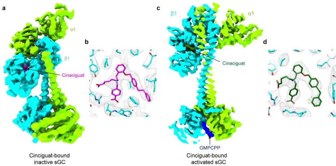 Cinaciguat是sGC的激活剂中的典型代表,可结合并激活三价铁血红素或无血红素的sGC。作者分别用三价铁血红素sGC和无血红素sGC制备了结合cinaciguat的冷冻电镜样品。令人意外的是,两种样品中的sGC颗粒均包含两种状态:与激活状态相似的伸展构象,以及与静息状态相似的弯折构象。这两种构象的电子密度分辩率分别达到3.9Å和4.1Å。在这两种构象中,cinaciguat均结合在βH-NOX结构域血红素的结合位点。在弯折构象中,与静息状态sGC的结构(PDBID:6JT1)比对,cinaciguat取代血红素使得F4和Y112的侧链位置移动,进而导致αF和βA的微小变动,引起感受器模块的构象变化,此变化经传导器模块传递到催化模块并放大,使得催化模块转动了8.6°,但是此构象中催化模块的GTP结合位点仍未打开,不能结合底物,说明该构象处于无活力状态。在伸展构象中,cinaciguat取代血红素导致的构象变化比弯折构象大得多,使得其最终处于完全伸展状态,与NO激活的sGC结构(PDBID:6JT2)对比RMSD仅为0.39Å,且有GTP底物结合,说明其处于高活力的激活状态。通过进一步的结构比对和突变体活力检测,作者发现在伸展构象的sGC中cinaciguat的结合推动了αF的C端导致了感受器模块的构象变化,经由传导器模块传递到催化模块,激活sGC。而在弯折构象中,cinaciguat推动αF的C端的Y112程度较小,不足以引起激活sGC的构象变化,因此sGC仍然处于弯折的静息状态。