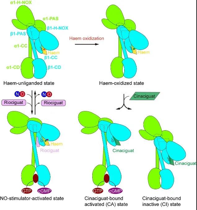 该研究揭示了sGC与YC-1类型的刺激剂和cinaciguat类型的激活剂结合并激活sGC的分子基础,为进一步优化和开发激活sGC的小分子药物奠定了基础。此两种类型的小分子均结合在非催化结构域,别构激活了sGC,也进一步验证了伸展构象与高活力sGC之间的关联,以及sGC激活过程中由弯折到伸展构象变化的重要性。