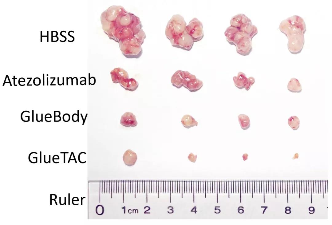 最后,作者进一步证明GlueTAC介导的PD-L1的降解能够比单纯阻断PD-1/PD-L1相互作用更为高效、持久地激活T细胞和抑制肿瘤生长。