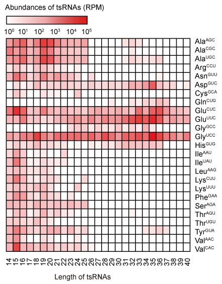 在这项研究中,戚益军课题组首先针对tRNA衍生小RNAs的特征,开发了一种基于RtcB连接酶的小RNA文库构建及测序方法(RtcB sRNA-seq),该方法能够同时捕捉并定量区分末端为3′羟基和3′磷酸/环磷酸的小RNAs。利用RtcB sRNA-seq,系统鉴定分析了拟南芥幼苗中5′ tRNA halves和5′ tsRNAs,发现80个tRNAs可产生近千个5′ tRNA halves和5′ tsRNAs,其中tRNA-Ala、tRNA-Gly和tRNA-Glu衍生的5′ tRNA halves和5′ tsRNAs丰度最高。tRNA-Ala主要产生19-nt的 5′ tsR-Ala, tRNA-Gly主要产生18-nt的5′ tsR-Gly和35-nt 5′ tRNA-Gly half,而tRNA-Glu则主要产生15-nt的5′ tsR-Glu和35-nt 5′ tRNA-Glu half(图1)。