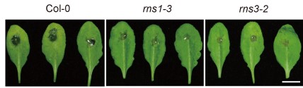 该研究进一步着重探索了5′ tsRNAs的产生机制及生物学功能。通过分析RNase T2家族RNA内切酶RNS1至RNS5突变体中5′ tsRNAs的积累,发现RNS1和RNS3负责产生包括5′ tsR-Ala在内的众多5′ tsRNAs。为了研究5′ tsRNAs的生物学功能,利用RNA测序方法分析了rns1和rns3突变体的基因表达谱,发现突变体中大量参与植物抗真菌的茉莉酸信号通路基因上调表达。灰霉菌接种实验表明,与野生型植物相比,rns1和rns3突变体更抗灰霉菌侵染(图2)。这些结果说明RNS1和RNS3可通过切割tRNAs产生5′ tsRNAs,负调控植物对灰霉菌的抗性。