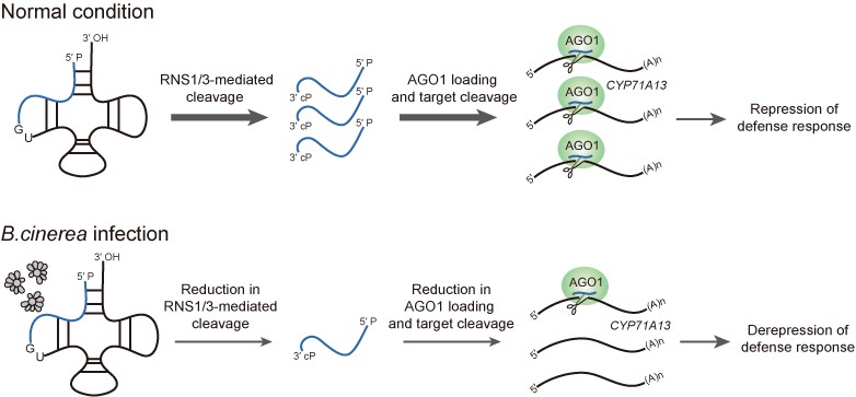 该研究最后阐明了其中一个丰度最高的5′ tsRNA,19-nt 5′ tsR-Ala的功能。发现5′ tsR-Ala能够与AGO1结合,并切割与其序列互补的靶标CYP71A13 mRNA,从而负调控CYP71A13基因的表达。CYP71A13编码植保素(植物产生的一种抗菌分子)合成途径中的一个关键酶。利用短串联模拟靶标(STTM)技术沉默5′ tsR-Ala,发现在5′ tsR-Ala沉默的植物中, CYP71A13表达上升,植保素含量增加,对灰霉菌抗性增强。特别有意思的是,研究发现植物在受到灰霉菌侵染时,包括5′ tsR-Ala在内的众多5′ tsRNA积累水平下降。