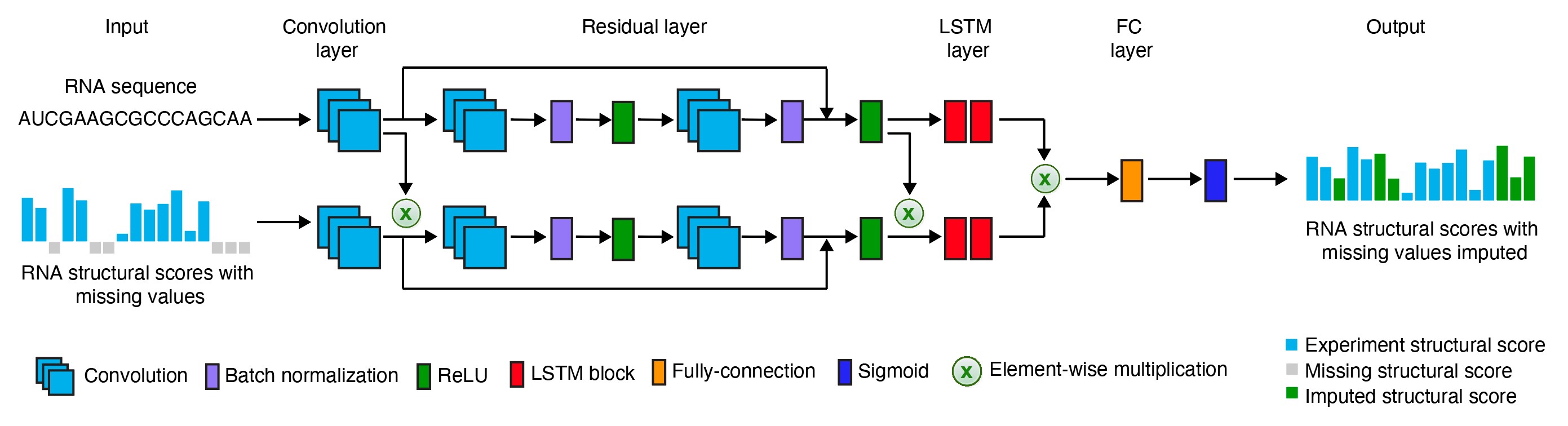 RNA结构是RNA发挥功能的基础。传统解析RNA结构的方法包括X射线、核磁共振和冷冻电子显微镜。这些方法无法做到高通量,更不能解析出细胞内高度动态的RNA结构。近年来,研究者们开发出了许多细胞内高通量探测RNA结构的技术,极大推动了RNA结构和功能的研究。但是这些技术探测到的RNA结构信号经常包含大量的缺失值,影响了后续对RNA功能的深入研究。人工智能方法在科学、技术多个领域都取得了成功应用,如果将其用于恢复由于实验和技术限制而缺失的RNA结构信号,很有可能解决上述问题。