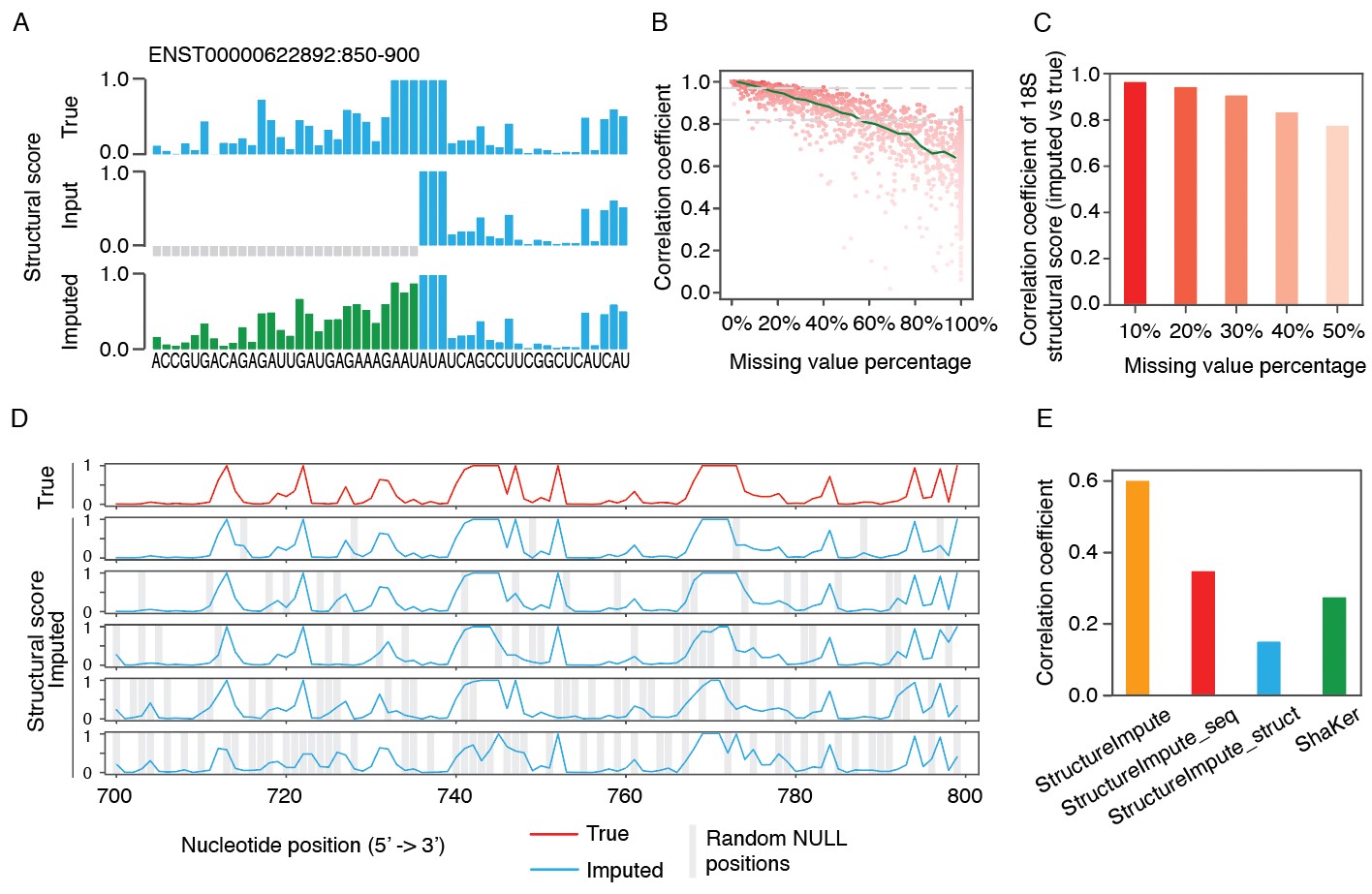 图2 StructureImpute的性能表现。A,实例展示StructureImpute从缺失的区域(灰色)恢复出的结构信号(绿色),实验测得的真实值为蓝色。B,不同比例的缺失值的恢复效果。C,StructureImpute与其他方法的效果比较。D-E, 不同缺失值比例下预测的 18S 核糖体 RNA 结构图谱与真实结构图谱的分布。