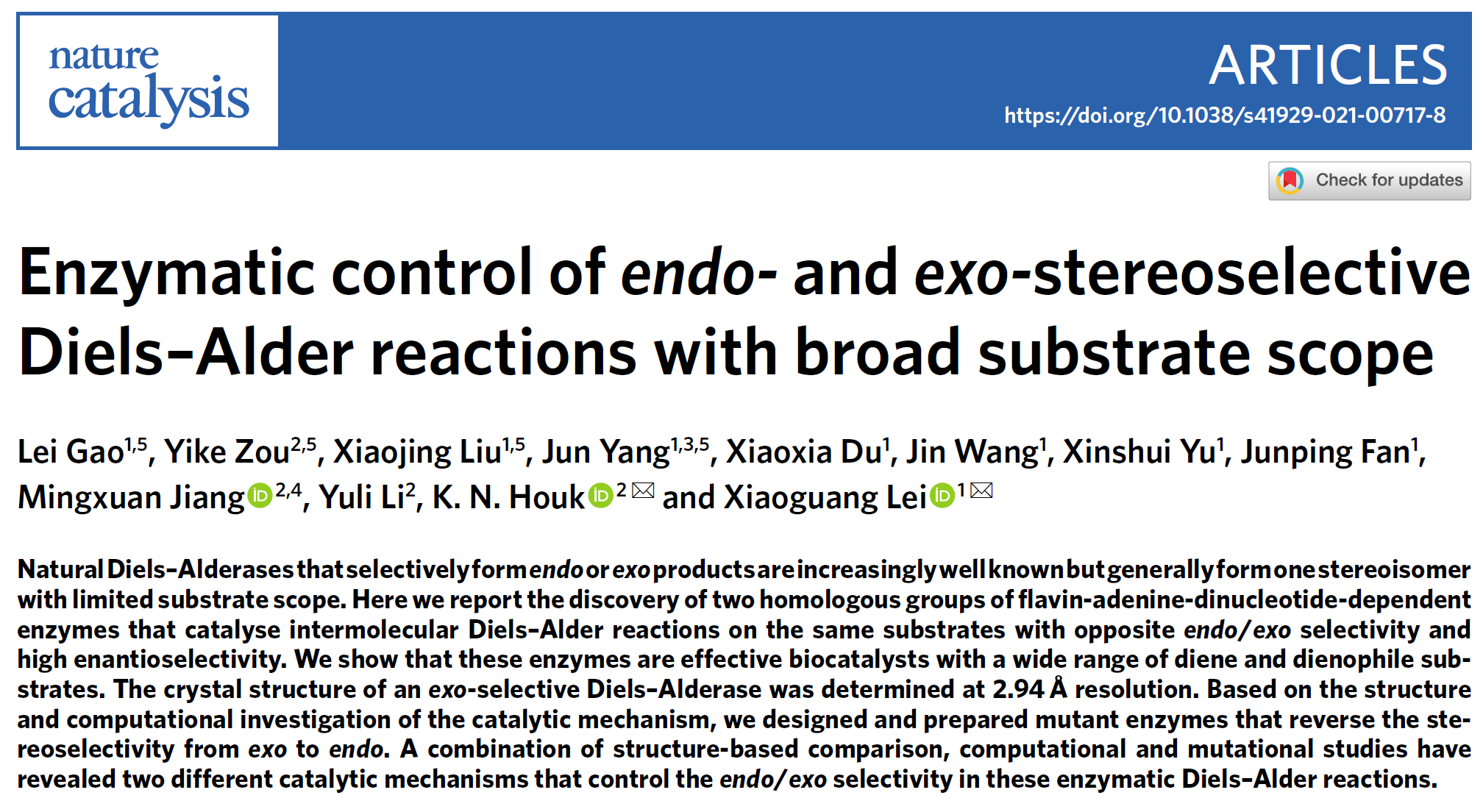 Nature Catalysis: 雷晓光课题组在酶催化领域取得重要科研突破:发现自然界中首例exo选择性的分子间Diels-Alder反应酶