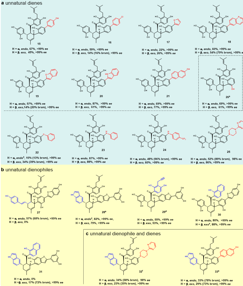 受到桑科植物中D-A类型天然产物生物合成的启发,作者从白桑中挖掘和鉴定到两类FAD依赖蛋白,其中一类FAD依赖蛋白(MaDA-1)具有与已知endo选择性D-A反应酶MaDA相同的功能,而另一类FAD依赖蛋白(MaDA-2和MaDA-3)催化了罕见的exo选择性的分子间D-A反应。作者还系统性探索了这两种选择性分子间D-A反应酶的底物适用范围,并利用它们实现了一系列天然和非天然D-A产物的高效精准合成,如图1所示。
