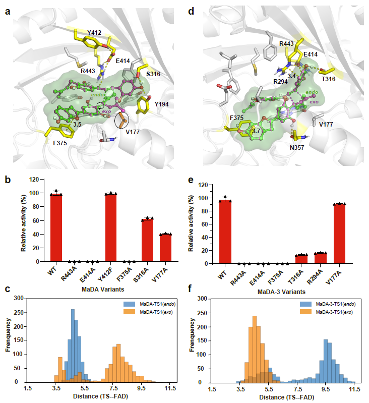 作者还成功解析了exo选择性D-A反应酶MaDA-3的晶体结构,并结合计算模拟以及突变实验解析了这两类D-A反应酶具有不同endo/exo选择性的机制。作者发现endo选择性D-A反应酶MaDA可以稳定结合endo过渡态而不能稳定结合exo过渡态(图2c);而exo选择性D-A反应酶可以稳定结合exo过渡态而不能结合endo过渡态(图2f)。当endo过渡态与MaDA结合时,R443可以与亲二烯体形成较强氢键相互作用,从而促进了反应的发生(图2a);而在MaDA-3中R294可以与亲二烯体形成较强的cation-p相互作用,从而促进了反应的发生(图2d)。