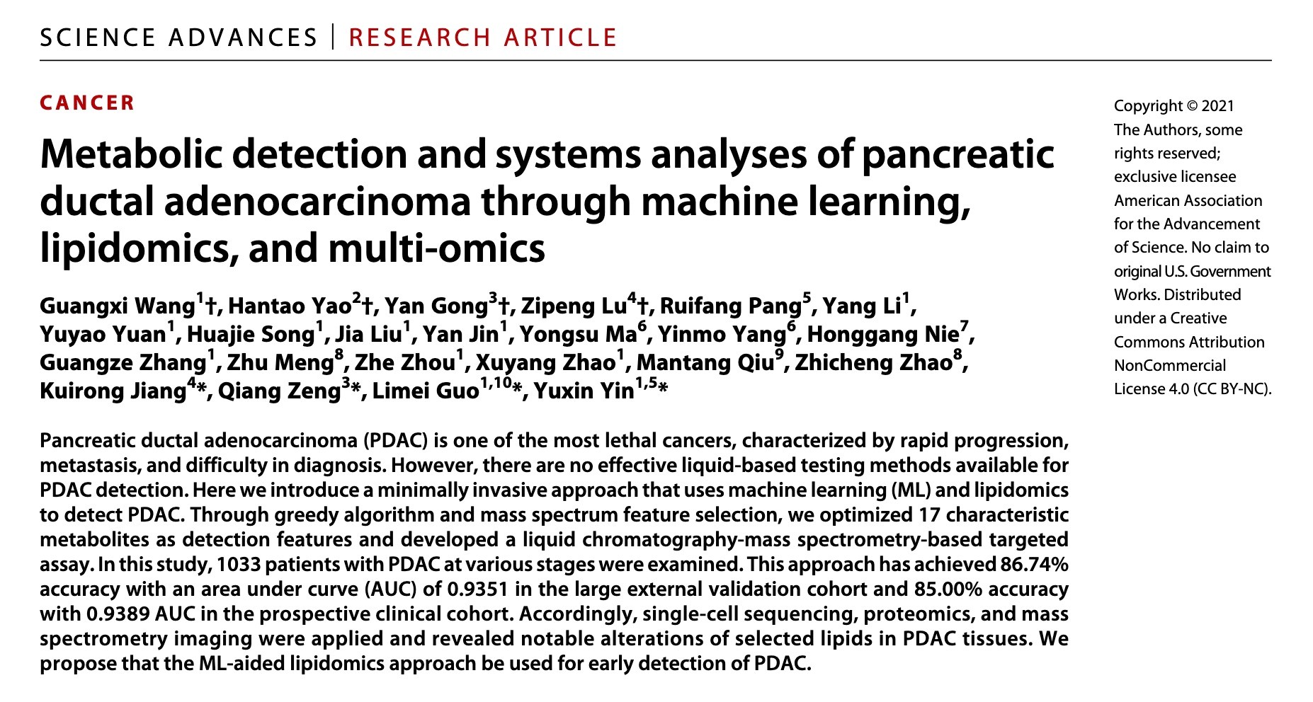 2021年12月22日,生命中心、北京大学基础医学院系统生物医学研究所尹玉新教授团队在【Science Advances】杂志上在线发表了题为“Metabolic detection and systems analyses of pancreatic ductal adenocarcinoma through machine learning, lipidomics, and multi-omics”的研究论文,应用机器学习结合脂质组学和多组学技术综合分析胰腺导管腺癌(胰腺癌)的代谢特征,开发了一套人工智能辅助的PDAC血清代谢检测方法,并展示了相关的分子机制。