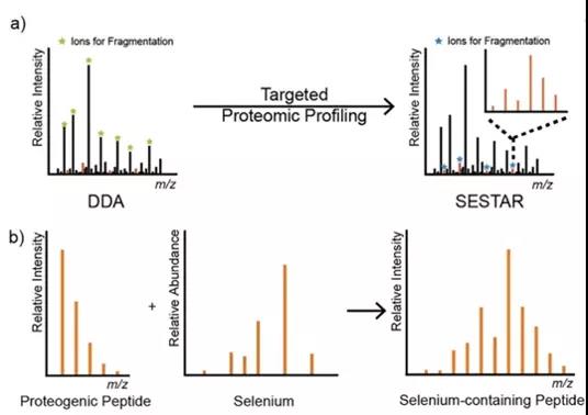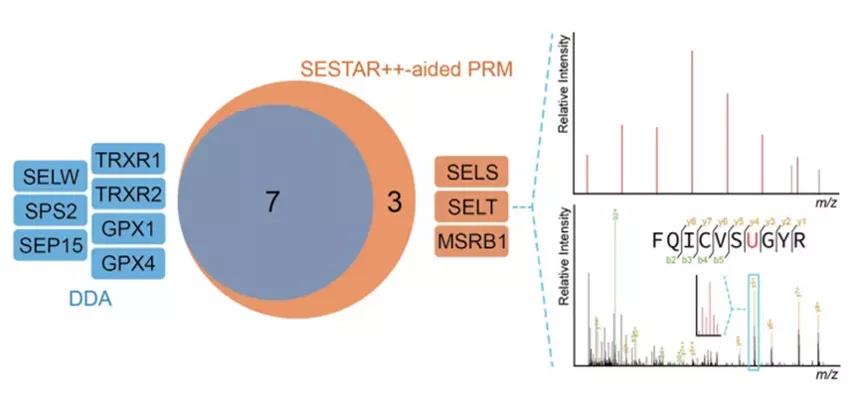 本文中使用了小鼠肝脏硒肽段富集样品进行测试,发现经SESTAR++辅助的PRM能相对于传统DDA鉴定到额外3个硒蛋白,且在一级谱及二级谱上都可以看到明显的硒特异同位素信号,进一步增强了可信度。