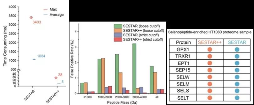 本文作者使用了C++重写SESTAR,并优化了部分算法,将计算速度提高了超过100倍,新算法命名为SESTAR++。在此前的使用过程中发现SESTAR对于高分子量肽段的识别假阳性率过高,原因可能在于随分子量的提高,含硒肽段与不含硒肽段的同位素分布差异变小。在SESTAR++中对算法进行了优化,降低了总体识别假阳性率,尤其是高分子量肽段的假阳性率,同时保证了对实际蛋白质组样品中硒蛋白的识别与原版SESTAR无异。SESTAR++也提供了windows操作系统下简单易用的图形用户界面,并且集成了方便后续质谱检测设置参数的inclusionlist生成功能,以及方便筛选靶标的肽段匹配功能。