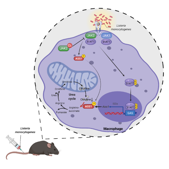 2022年1月10日,该课题组在Molecular Cell杂志上以Article的形式发表了题为“ASS1对瓜氨酸的消耗是促炎症巨噬细胞激活和免疫反应所必需的(Citrulline depletion by ASS1 is required for proinflammatory macrophage activation and immune responses)”的研究论文。在本项研究工作中,研究人员揭示了尿素循环代谢酶ASS1及其底物瓜氨酸在先天免疫反应中的重要作用。诱导小鼠骨髓来源的巨噬细胞发生促炎症极化后,可导致ASS1的表达显著升高,与之相伴随的是其代谢底物瓜氨酸的消耗,而尿素循环中的其他代谢物的水平没有发生显著的变化。深入的机制探究发现,在巨噬细胞的促炎症极化过程中,JAK2-STAT1信号通路的活化上调了ASS1的转录表达,同时在短时间内迅速磷酸化ASS1的Y87位点,从而提高了ASS1的酶活性和导致细胞内瓜氨酸快速和剧烈消耗。更深入的研究发现,ASS1的敲除会导致巨噬细胞中瓜氨酸的累积,而高水平的瓜氨酸会与JAK2直接结合,从而削弱JAK2与IFNγR2和STAT1的结合,抑制JAK2-STAT1信号通路的活性,从而抑制巨噬细胞的促炎极化以及小鼠的抗拒感染能力。