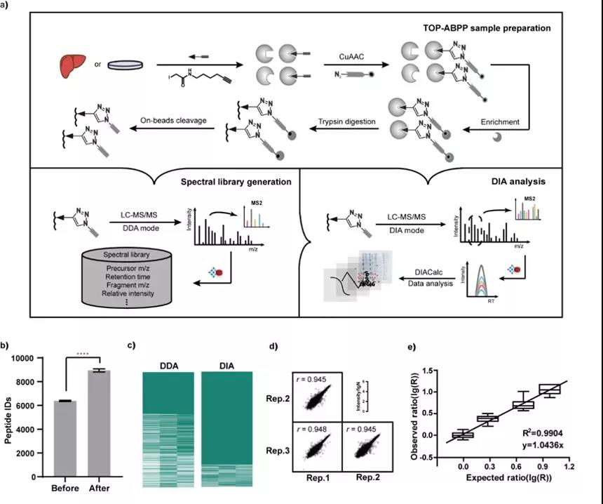伴随着高灵敏度、高分辨率、高精度的质谱仪器的快速更新,以及生物信息学对于海量数据处理能力的不断提高,近些年来兴起的基于数据非依赖型采集的质谱采集模式Data-independent acquisition,简称DIA)逐渐在蛋白质组学研究领域中崭露头角。与传统的DDA模式不同,DIA模式并不仅限于对高强度的肽段离子进行采集和分析,而是将离子根据质荷比大小划分成若干个采集窗口后,对每个窗口中所有肽段进行合并分析,从而可以实现无遗漏、无差异的肽段信息采集,因此,DIA模式具有更好的覆盖度,重现性以及定量准确性。基于此,在本工作中,作者将DIA模式与化学蛋白质组学技术(Activity-based protein profiling,简称ABPP)相结合,发展了名为DIA-ABPP的无标定量方法。该方法解决了之前定量技术中由DDA模式引起的数据丢失严重以及高成本的同位素标签试剂的使用等问题,是一种具有覆盖度高、重现性好以及定量准确的化学蛋白质组学新策略。