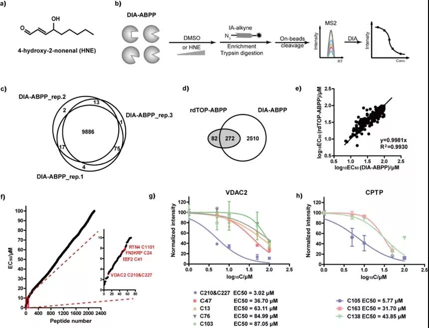 在完成方法的建立后,作者首先利用DIA-ABPP对活性代谢物修饰半胱氨酸的反应性进行了系统的分析。细胞在受到氧化压力刺激时,内膜结构中的长链不饱和脂肪酸容易受到活性氧自由基的攻击,会产生包含4-羟基壬烯醛(HNE)在内的一系列脂源性亲电小分子。研究显示,HNE可以通过共价修饰蛋白质,从而对细胞增殖、信号转导、基因表达等细胞过程进行调控。因此,作者利用DIA-ABPP技术构建了浓度梯度竞争策略,系统地分析了每个活性半胱氨酸对应的HNE剂量效应曲线以及半数效应浓度(EC50)。除了已知的HNE修饰位点外,本工作还发现神经酰胺-1-磷酸转移蛋白(CPTP)的C105也是对于HNE高敏感的半胱氨酸位点,这些数据可以为后续内源亲电修饰在细胞内的生物机制研究提供更加完整的数据支持。