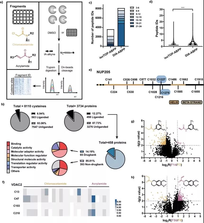 此外,作者也将新方法用于共价片段小分子库的筛选。此前Backus等人利用基于DDA的定量ABPP技术对含有氯乙酰胺和丙烯酰胺的小分子库进行分析,以发现新的可靶向的半胱氨酸,从而实现其对应蛋白质的功能调控,然而由于方法重现性较差,包含所有片段结合信息的半胱氨酸数目只占总数目的0.2%,极大地限制了筛选的效率。为了展示DIA-ABPP的具有更好的重现性和更高的覆盖度,作者选择原来片段库中的24个片段分子进行分析,发现除了能够获得更加完整的数据信息外(在DIA-ABPP发现中,67.35%的半胱氨酸具有至少21个片段的定量信息,在isoTOP-ABPP中为5.80%),对于单一蛋白而言,新方法可以鉴定到更多的半胱氨酸位点,例如核孔蛋白NUP205,DIA-ABPP方法可以定量16个半胱氨酸,而原来的方法只能2个半胱氨酸的定量信息。此外,作者也对具有相同结合基团,不同反应基团的片段分子对进行了头对头的比较,强调了反应基团对半胱氨酸靶向性的影响。