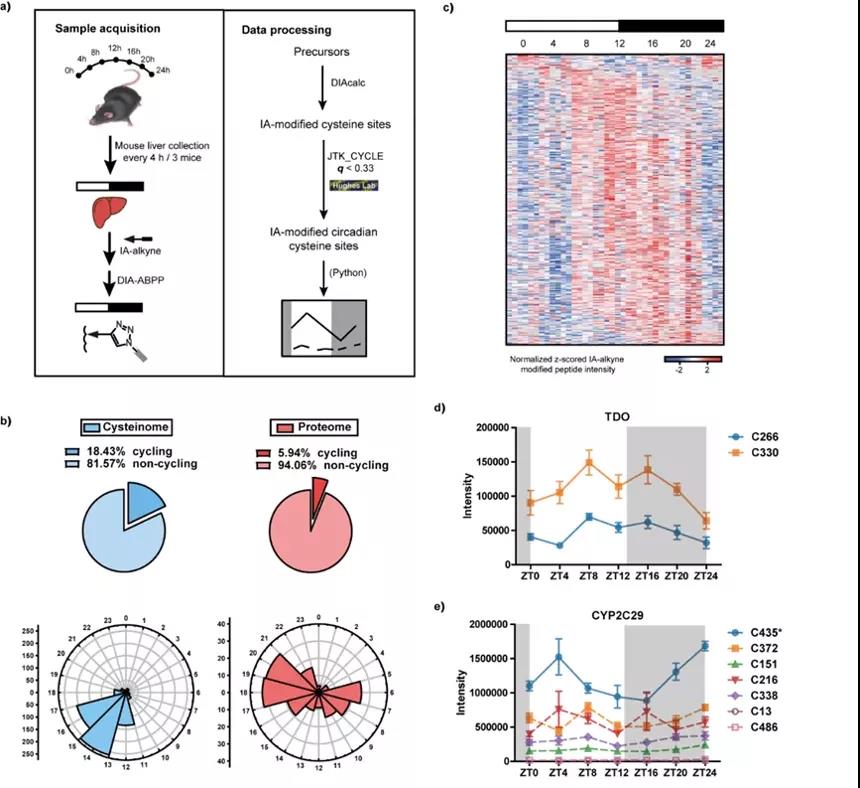 最后,作者将DIA-ABPP技术应用于生物钟机制的研究中。生物体的生物钟振荡器由遗传和代谢两部分组成,他们协同配合从而对代谢行为进行调控。代谢振荡器中的活性氧通路是目前发现的在生物钟进化过程中最保守的通路。蛋白质组中对活性氧物质最敏感的氨基酸是半胱氨酸,所以本工作进一步利用DIA-ABPP方法对小鼠肝脏中具有昼夜节律活性特征的半胱氨酸组进行了系统的鉴定。作者发现在所有定量的半胱氨酸中,18.43%的半胱氨酸活性具有昼夜节律特征,其比例远远高于蛋白质,且两者相位的峰值具有明显的差异。除了氧化还原通路外,我们还发现这些活性具有昼夜节律特征的半胱氨酸富集在代谢通路以及泛素-蛋白酶体系统中,这些数据为生物钟机制的研究提供了新视角和新线索。