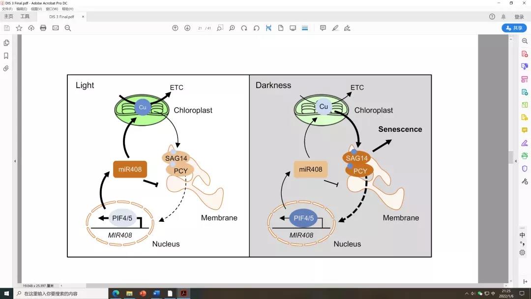 通过进一步的分子生物学实验,发现SAG14-PCY模块受到一个陆生植物中高度保守的microRNA,miR408的抑制,而miR408又受到暗诱导的叶片衰老中已知的关键转录因子光敏色素相互作用因子PIF3/4/5的抑制。因此,在黑暗条件下,PIF3/4/5的稳定抑制了miR408,导致SAG14-PCY的积累而引发衰老(图2)。SAG14-PCY模块介导的胞内铜再分配在暗诱导的叶片衰老过程中发挥的重要作用,表明铜离子是一个潜在的衰老信号。进一步破译铜的动态平衡机制及其与其他衰老调控途径的相互作用,将为理解叶片衰老这一重要植物过程提供新的研究方向。