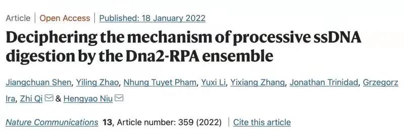 2022年1月18日,北京大学定量生物学中心、生命科学联合中心齐志实验室与美国印第安纳大学牛恒尧实验室以及美国贝勒医学院Grzegorz Ira实验室在Nature Communications杂志发表题为Deciphering the mechanism of processive ssDNA digestion by the Dna2-RPA ensemble的文章。