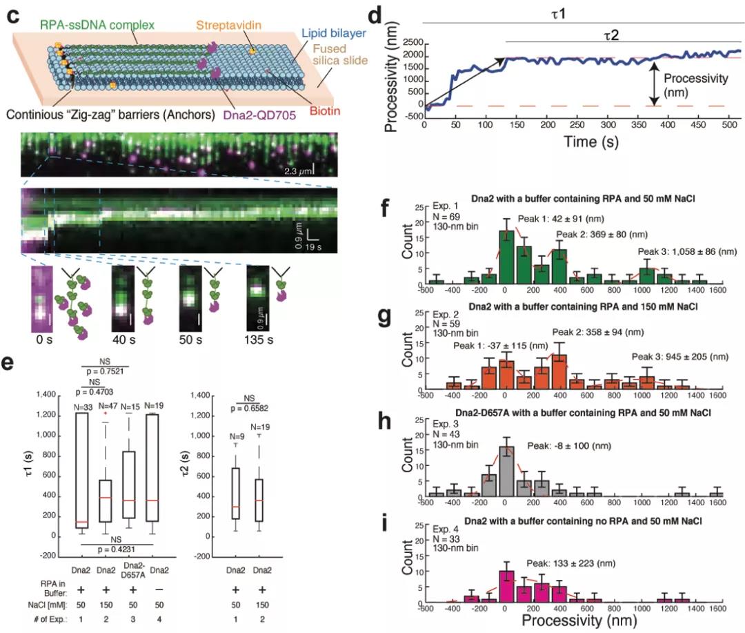 图1. DNA幕帘技术揭示Dna2可行进性消化RPA结合的5’-单链DNA。