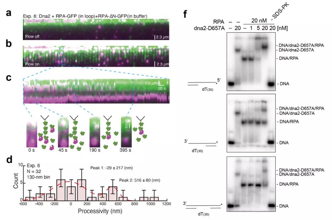 图2. DNA幕帘技术揭示Dna2可行进性酶切RPA结合的5’-单链DNA。