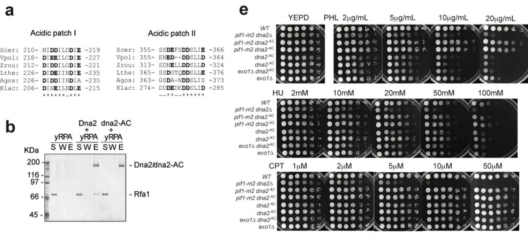作者同时在研究融合蛋白NAB-dna2-∆248N的过程中,发现其虽然可以行进性消化单链DNA,但却无法有效消化单链DNA中包含的复杂二级结构区域,以及无法在单链DNA/双链DNA交界处完成消化后有效脱离底物。造成这些问题的关键之处,可能是在NAB-dna2-∆248N融合蛋白中Dna2与RPA的反式相互作用被抑制,而无法与溶液中的RPA或结合单链DNA二级结构的RPA有效相互作用。在Dna2中,负责与RPA的反式相互作用的区域是位于Dna2的N端的一段酸性氨基酸区域(图4)。突变这段酸性氨基酸而形成的Dna2突变体(dna2-AC)仍可以与RPA在单链DNA上形成三元复合物,但与RPA在溶液中的相互作用则明显变弱。遗传学上,dna-AC突变株酵母本身可存活,但对DNA双链断裂诱导剂(phleomycin)药物处理非常敏感。利用同体转换核酸内切酶测试(HO endonuclease assay),发现AC结构域对于Dna2在酵母体内进行长程切除(long-range resection)的活性是至关重要的。