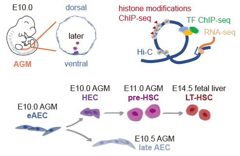 为了探究哺乳动物胚胎中多维表观遗传层级如何调控HSC发生这一科学问题,该研究突破了少量细胞检测的技术瓶颈,应用少量细胞sisHi-C(small-scale in situ Hi-C)技术3和何爱彬团队于2019年开发的少量细胞itChIP-seq(indexing and tagmentation-based chromatinimmunoprecipitation sequencing)技术4,分别在数百个细胞中,检测染色质互作结构、组蛋白修饰及转录因子结合图谱。作者从小鼠胚胎的主动脉-性腺-中肾区和胎肝中分别收集了HSC发育路径上相邻的四种细胞类型:eAEC、HEC、pre-HSC以及LT-HSC(图1)。结合团队近期发表的单细胞转录组数据1, 2,以大范围到小范围的不同层级染色质空间结构发育变化为主线,进行HSC起源的多维表观遗传调控机制解析。