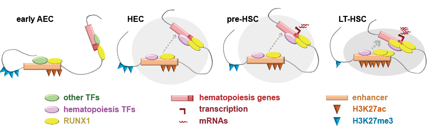 HSC特异的增强子在eAEC中已经处于一定程度的激活状态。与以往的从无到有的增强子激活认知不同的是,在EHT初期的eAEC中,造血过程相关TAD中的增强子已经显著富集激活性组蛋白修饰(H3K27ac和H3K4me1)。从eAEC经过HEC,到pre-HSC,增强子的活性信号并没有变化,仅在pre-HSC至LT-HSC这一阶段才进一步增强。这提示在eAEC中,已经初步准备好了造血发生的相关染色质修饰基础,但需要染色质互作结构及转录因子的结合,驱动促进HSC产生(图2)。