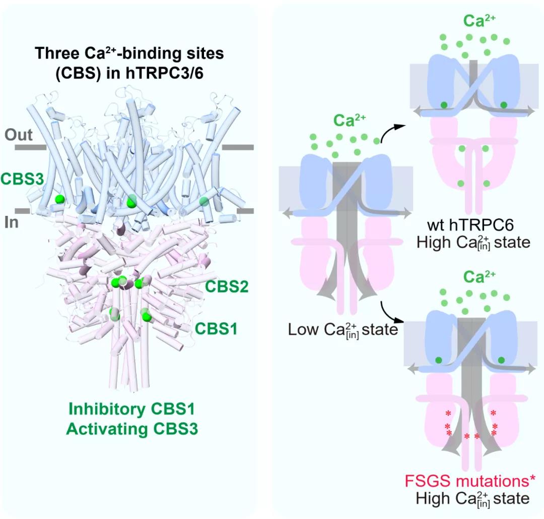 综上所述,本项研究通过结构解析以及功能验证,确定TRPC3/6通道在胞质区有一个抑制性Ca2+结合位点CBS1。当Ca2+浓度较高时,该位点会结合Ca2+,促进多个胞质区结构域之间的紧密堆积,从而抑制阳离子从TRPC通道胞质内空腔向细胞质的流动。当Ca2+浓度较低时,Ca2+从该位点解离,使胞质区呈现较为松散的结构,从而打开了离子从胞质内空腔向胞质区流动的通路。这个抑制位点提供了Ca2+对TRPC通道的负反馈调节。TRPC通道在跨膜区还具有激活型Ca2+结合位点CBS3。抑制型和激活型Ca2+结合位点的作用相互叠加,导致了TRPC通道对胞内钙离子浓度复杂的响应。而在FSGS患者中发现的TRPC6 GOF突变破坏了TRPC6胞质区的抑制性CBS1的功能,但不影响激活型CBS3的功能,从而使突变体通道在有Ca2+流入的情况下发生正反馈而持续激活,肾脏足细胞Ca2+离子过载,最终引发FSGS疾病的发生(图1)。此外,不同小分子抑制剂BTDM和SAR7334在TRPC6上的结合位点迥异,并且使TRPC6处于不同的关闭构象,从而为基于结构的药物设计提供了理论支持。
