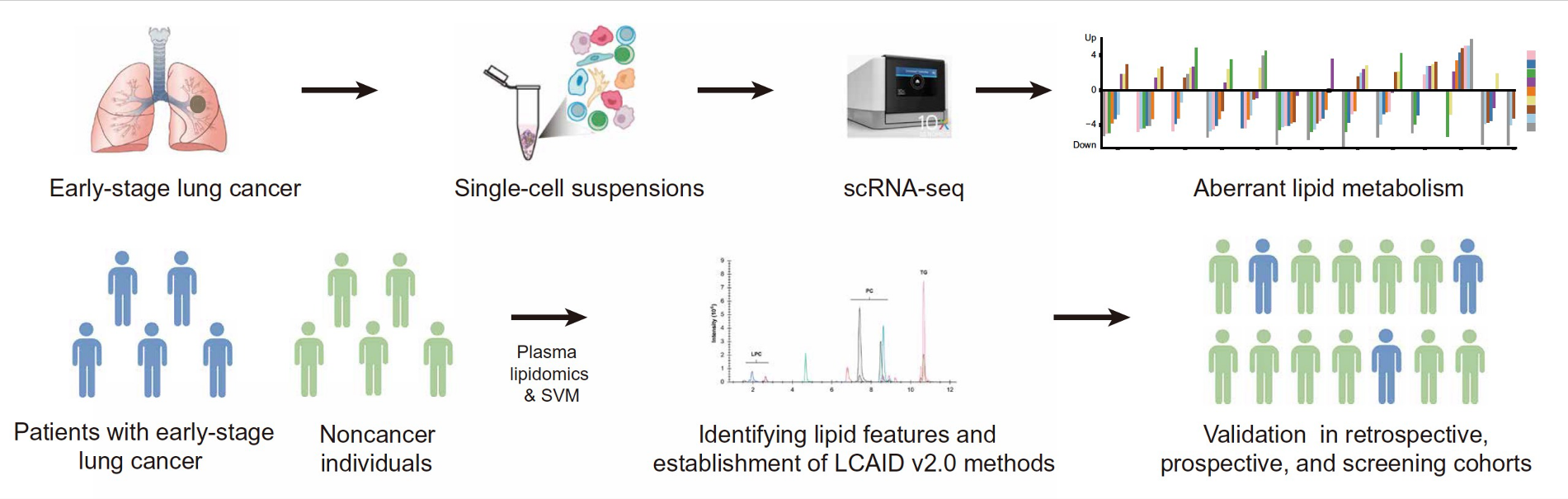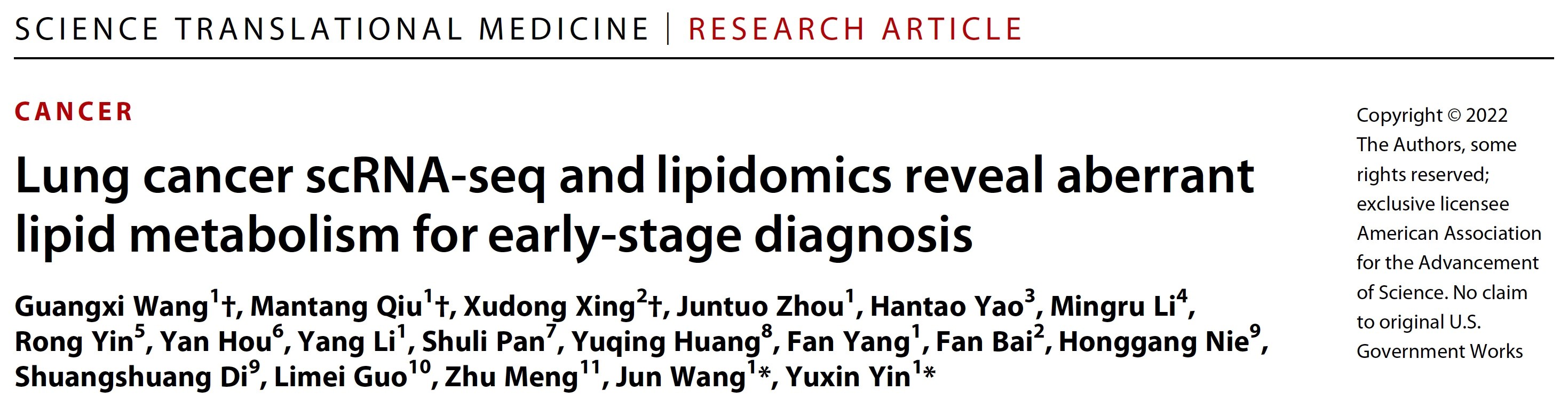 2022年2月2日,北京大学人民医院王俊院士团队和生命中心、北京大学基础医学院尹玉新团队合作在Science Translational Medicine杂志上在线发表了题为“Lung cancer scRNA-seq and lipidomics reveal aberrant lipid metabolism for early-stage diagnosis”的研究论文,应用单细胞转录组学、血浆脂质组学、机器学习和质谱成像综合分析早期肺癌的脂代谢特征,开发了一套人工智能辅助的早期肺癌代谢检测方法,并揭示了相关的分子机制。