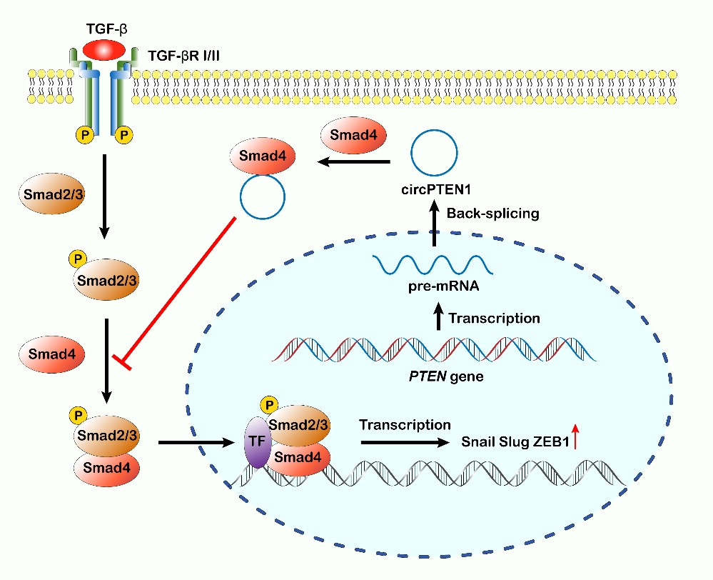 环状RNA(circular RNA,circRNA)是一类共价键连接、不具有3’和5’末端头尾结构的环状非编码RNA。研究揭示circRNA与多种人类肿瘤的发生发展密切相关,因此深入研究并阐明circRNA对肿瘤发生发展的调控作用和具体机制具有重要意义。本研究中尹玉新团队鉴定了一种由PTEN mRNA第1至5外显子环化剪接生成的环状RNA:circPTEN1。circPTEN1在结直肠癌组织中表达下调,临床分析表明circPTEN1 的表达水平与结直肠癌患者的预后密切相关,敲低circPTEN1 促进结直肠癌的侵袭和转移,而 circPTEN1 的过表达则表现出显著抑癌效应。他们发现circPTEN1 能够结合 Smad4以减少 Smad 复合物的形成和细胞核定位,进而拮抗TGF-β/Smad通路介导的转移关键基因的表达、抑制结直肠癌的侵袭和转移。circPTEN1的鉴定进一步揭示了PTEN基因家族成员的多样性,为PTEN基因的复杂功能提供了分子基础,同时也为靶向TGF-β/Smad通路调控肿瘤侵袭和转移的治疗策略提供了新的靶点和研究方向。