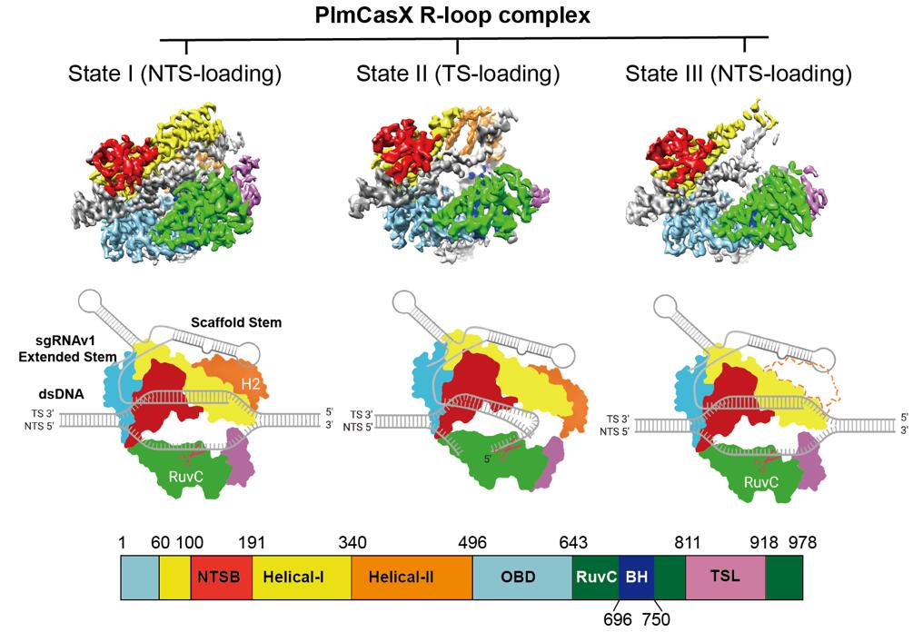 图1: PlmCasX R-loop复合物的三种结构状态。