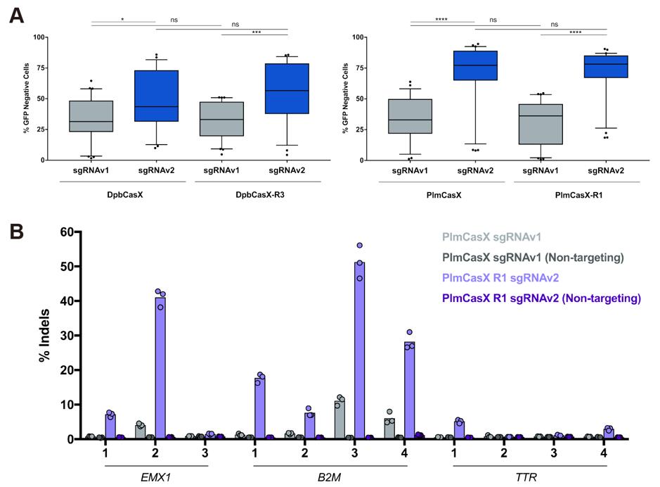 图2: 改造前后的CasX基因编辑效率对比。最新的CasX基因编辑平台,可对GFP位点产生平均80%左右的编辑效率(A),对测试的内源位点可产生最高50%的编辑效率(B)。