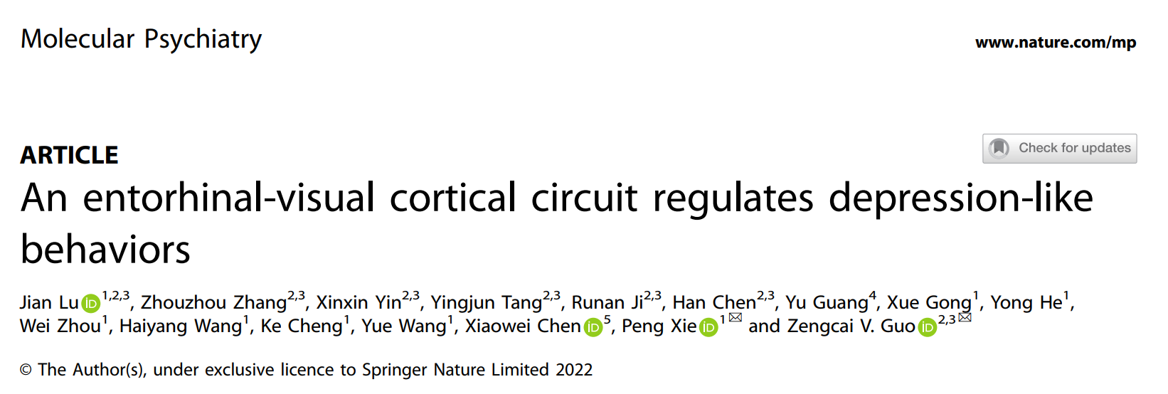 清华大学医学院、生命科学联合中心、IDG/麦戈文脑科学研究院郭增才课题组联合重庆医科大学谢鹏课题组在精神疾病领域权威学术期刊《分子精神病学》(Molecular Psychiatry)在线发表题为《一条从内嗅皮层到视觉皮层的神经环路调控抑郁样行为》(An entorhinal-visual cortical circuit regulates depression-like behaviors)的研究论文,揭示从内嗅皮层→次级视觉皮层内侧区的神经环路在抑郁症中可能发挥重要调控作用。