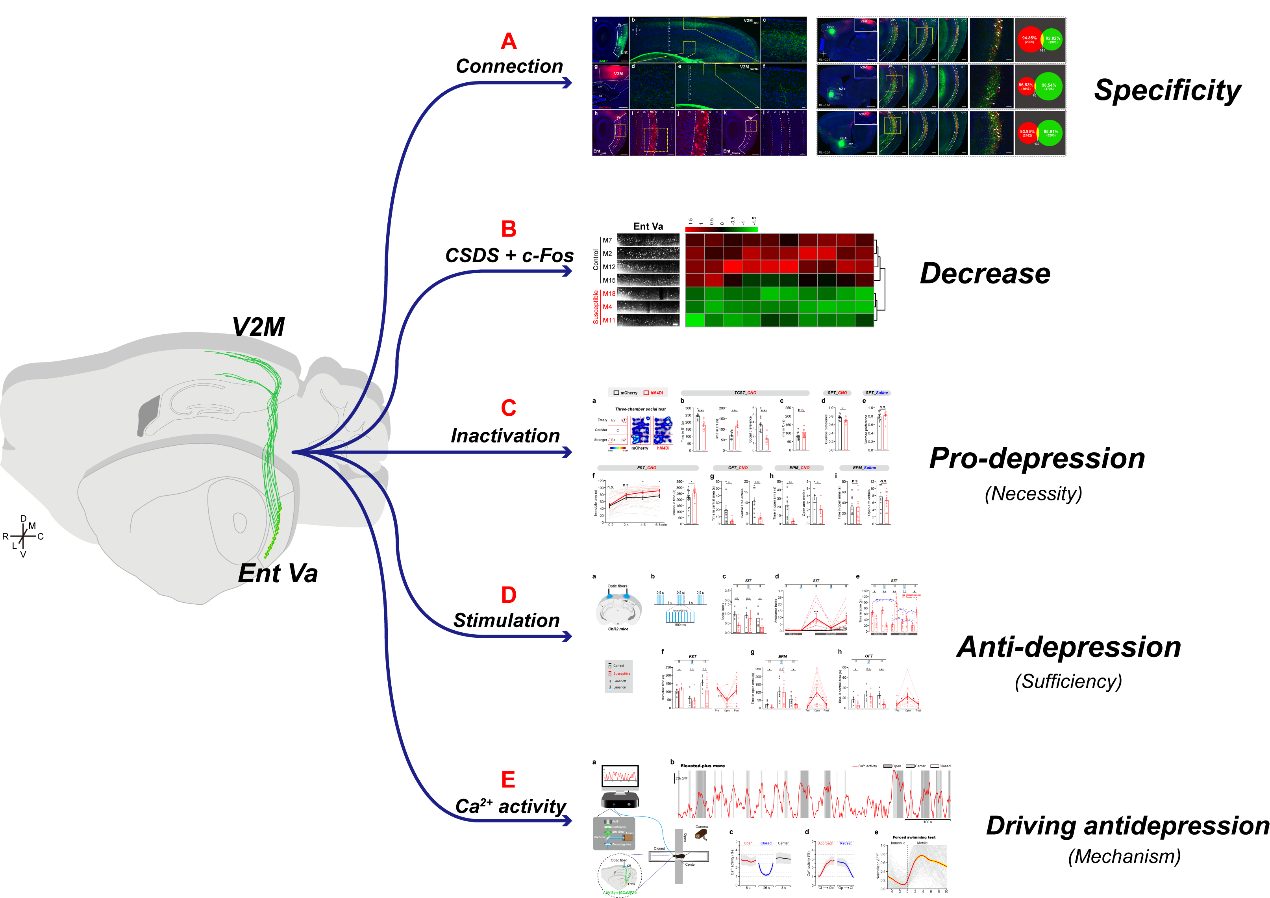 图1 Ent→V2M通路对抑郁样表型的双向调控及相关机制。A Ent→V2M通路的结构连接及其特异性;B 慢性社会挫败应激(CSDS)致使Ent Va的神经活性降低;C 化学遗传抑制Ent→V2M通路可以诱导健康小鼠产生抑郁样的行为表型,表明该通路对于抑郁样表型的必要性;D 光遗传激活该通路快速缓解小鼠的抑郁样表型,提示该通路对于抗抑郁样表型的充分性;E Ent→V2M通路活动增强可以驱动小鼠转向抗抑郁的状态。